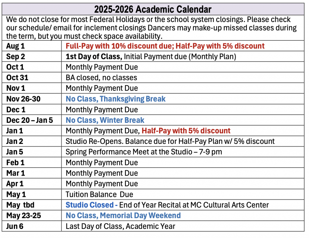 The 2024-2025 Academic Term runs September 3 through June 7. Classes will be held as scheduled. We do not follow school closings or Federal Holidays with the exception of Labor Day and Memorial Day Weekend.