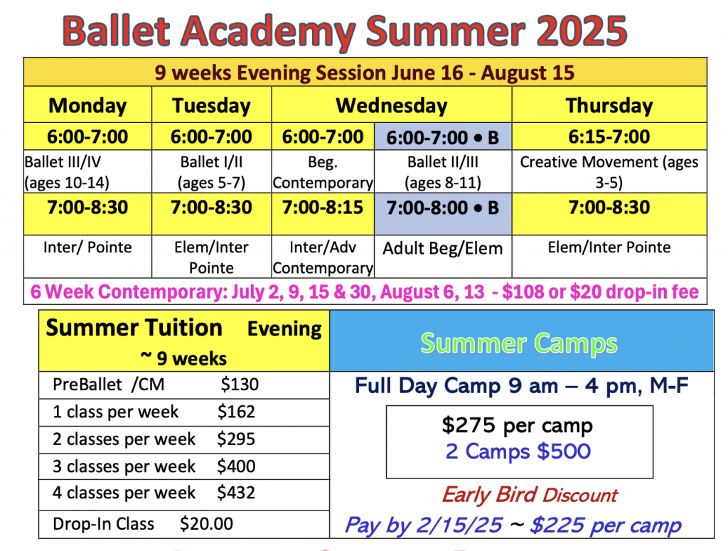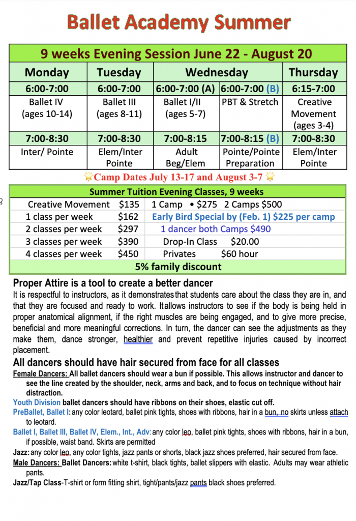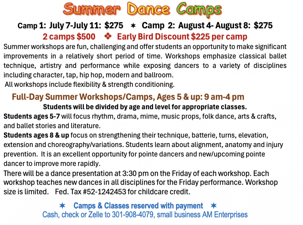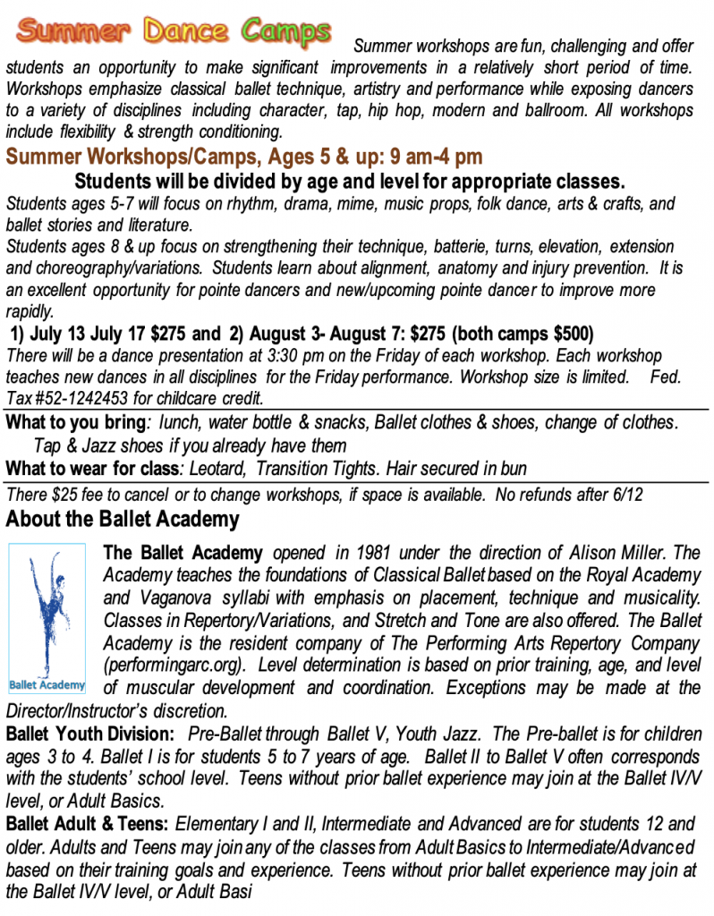 Summer Workshops/Dance Camps are fun and challenging and offer students an opportunity to make significant improvements in a relatively short period of time. Workshops emphasize classical ballet technique, artistry and performance while exposing dancers to a variety of disciplines including character, tap, hip hop, modern and ballroom. All workshops include flexibility & strength conditioning.